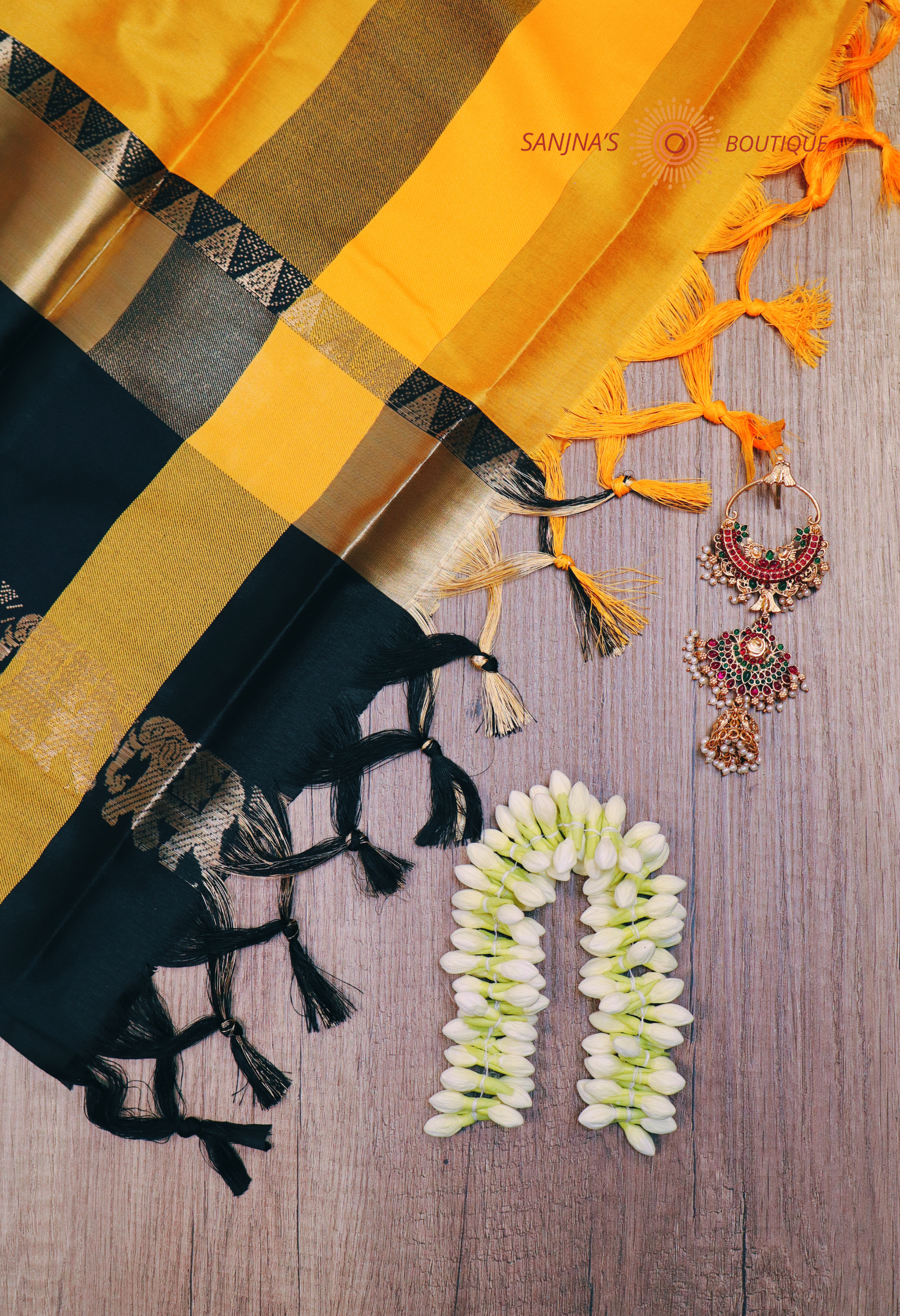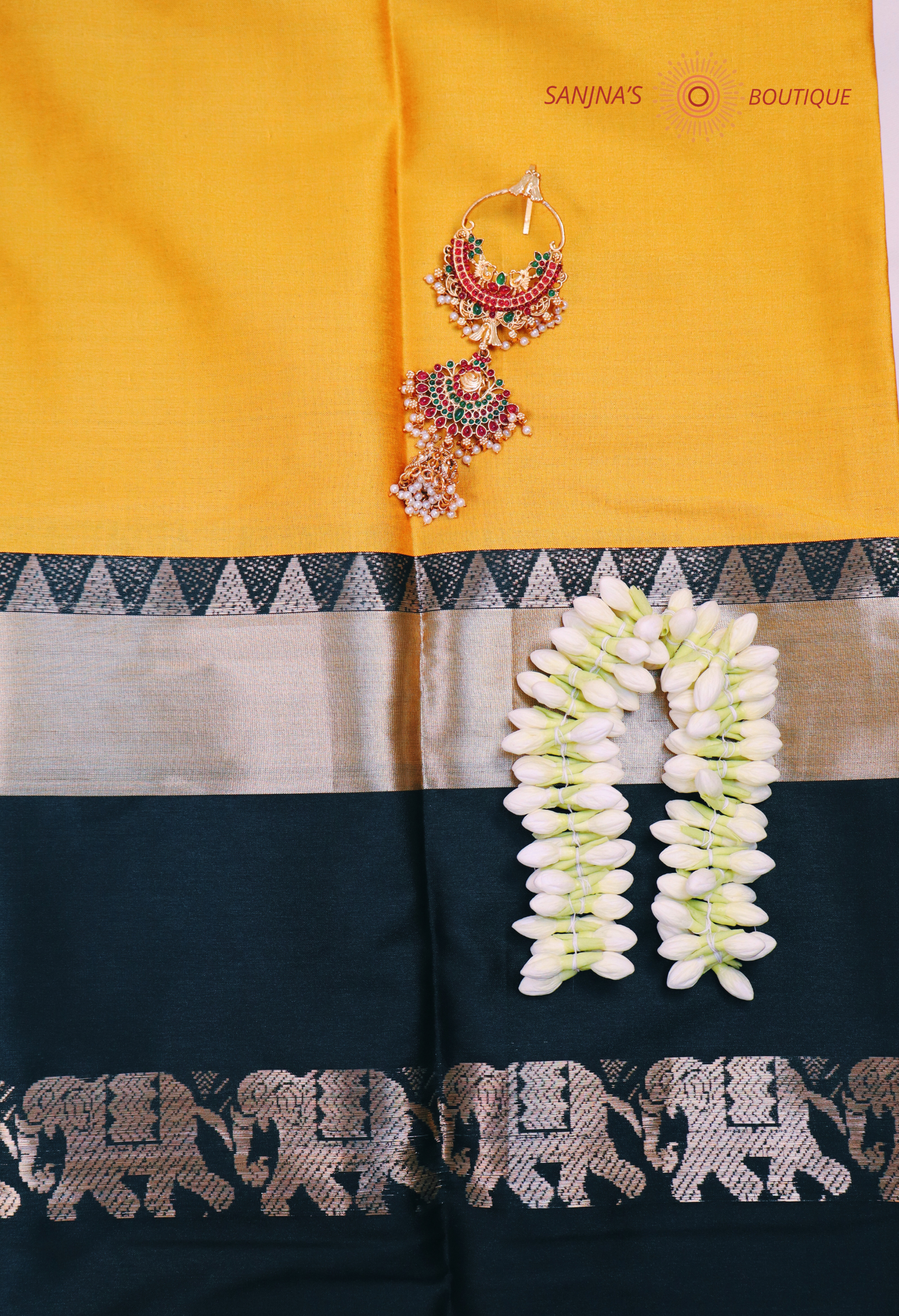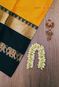 Featuring a striking black border with elephant motifs, this saree blends tradition with modern elegance.