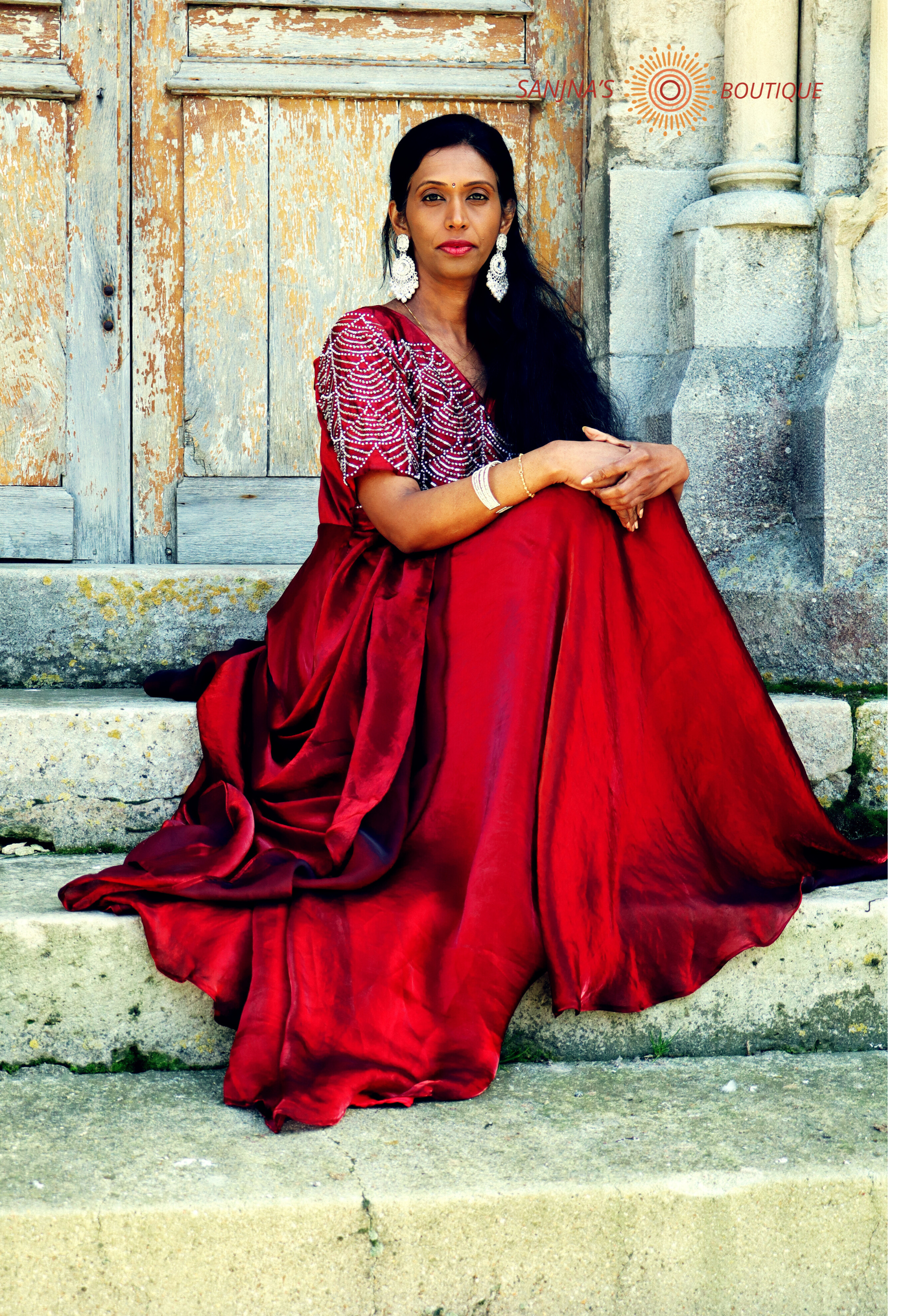 Wine Red Organza Anarkali Gown with Pearl & Sequin Embroidery – Mocha Luxe