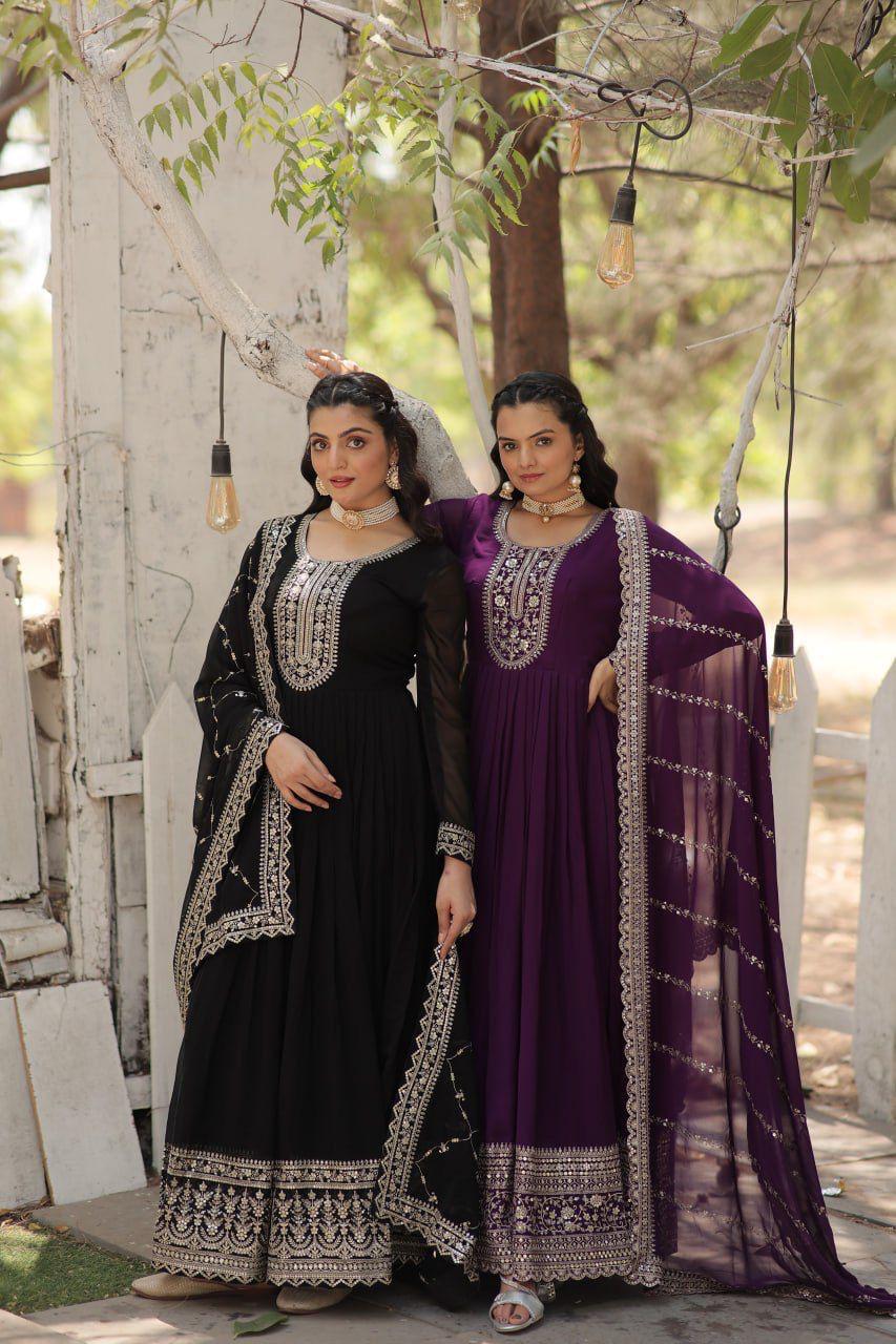 Step into timeless elegance with our trending Dark Violet gown crafted from luxurious Georgette fabric adorned with shimmering sequins. Paired with a beautifully multi-embroidered dupatta, this ensemble is the perfect fusion of modern glamour and traditional artistry. Designed to make you shine at weddings, parties, and festive occasions, this gown ensures you stand out with grace and sophistication.