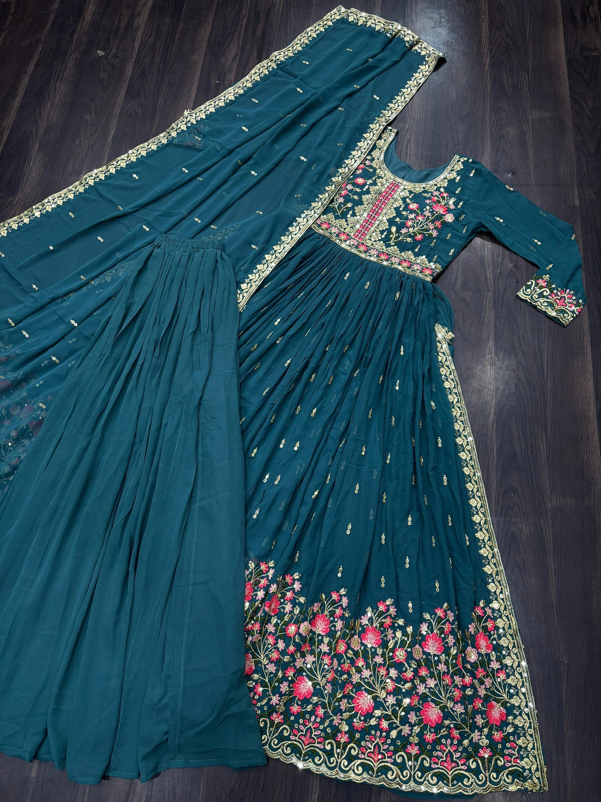 Premium Peacock Green Sharara with Gerogette Fabric, Sequins & Foral Multi-Embroidered Dupatta